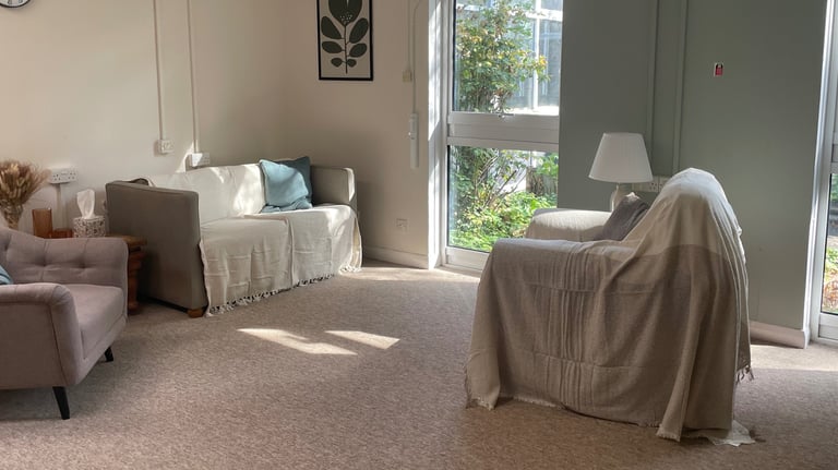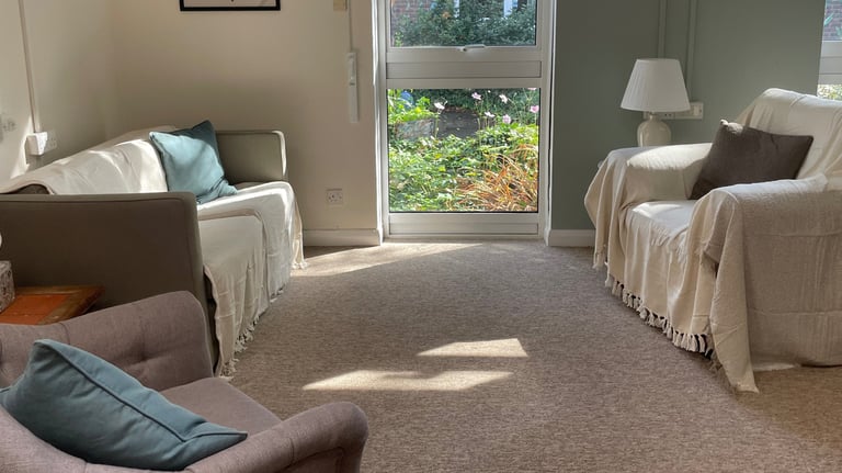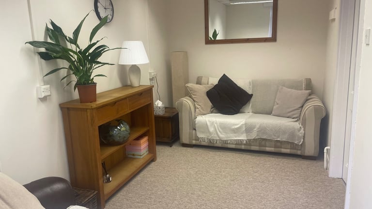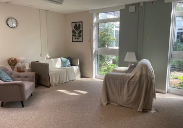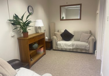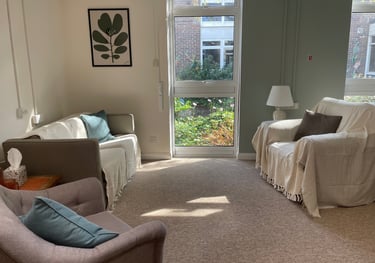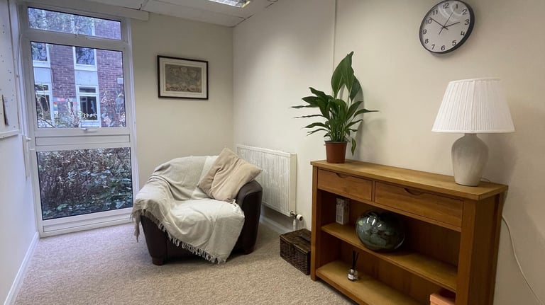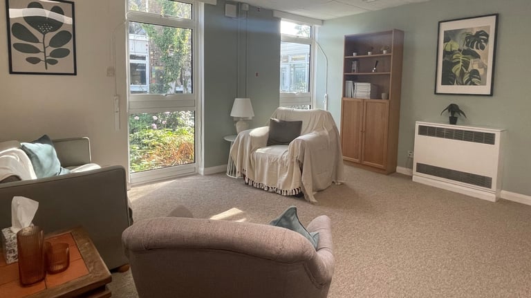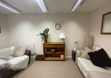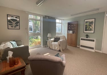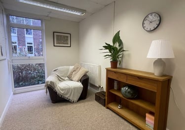 This consulting room has been recently refurbished and includes 1 armchair and a 2 seater sofa, that would be suitable for both individual and couples therapy. The room benefits from natural light as the room overlooks an internal garden. There is additional room lighting and lamps to create a comfortable and welcoming space to see clients/patients.